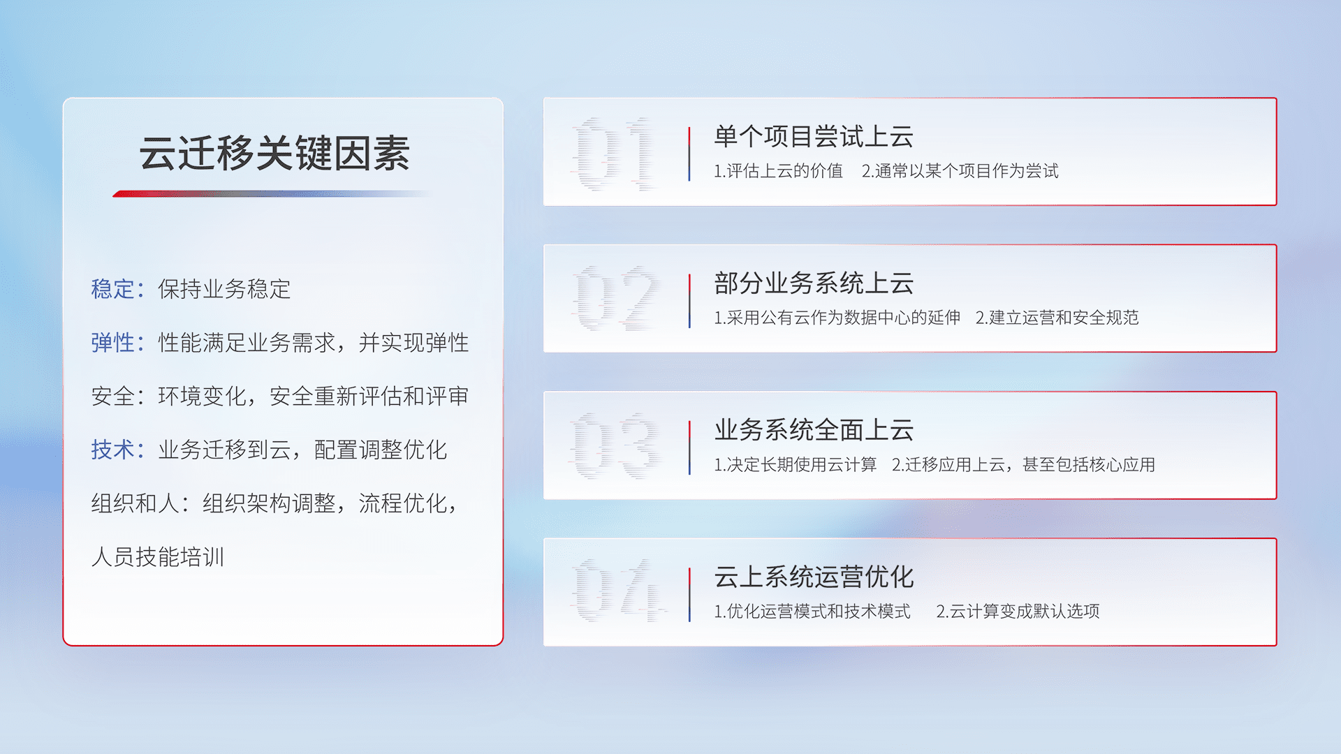 结合实际业务,,,,从规划设计、、、云平台选型、、、云原生改造、、数据迁移、、集成交付,,,,迁移全过程为客户识别最佳上云路径,,做好风险识别管理,,设计网络架构、、、身份权限、、安全审计合规、、、、操作审计、、、、日志审计、、、监控告警策略、、、多站点容灾设计等,,,对云上基础设施进行整体规划,,,,提升IT治理水平,,,,以满足弹性、、、高可用、、高性能的需求。。。。