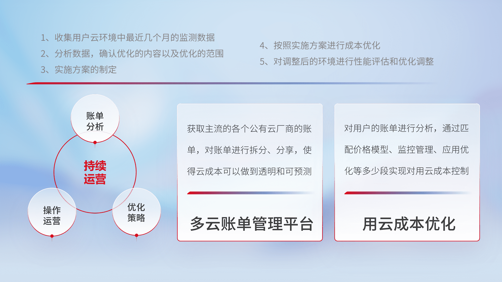 通过多云纳管,,,,以统一的资源数据模型把客户的云资源进行抽象和封装,,进而实现对多云资源的统一操作,,,保障云资源管理的可靠性、、、稳定性与可用性。。。量身定制化运维内容,,配置、、、、开发运维、、、、补丁管理、、、、备份、、监控、、、、认证和访问管理、、、审计和日常巡检等,,,,保障在用云过程中的可靠度,,,,稳定度以及高可用率。。。