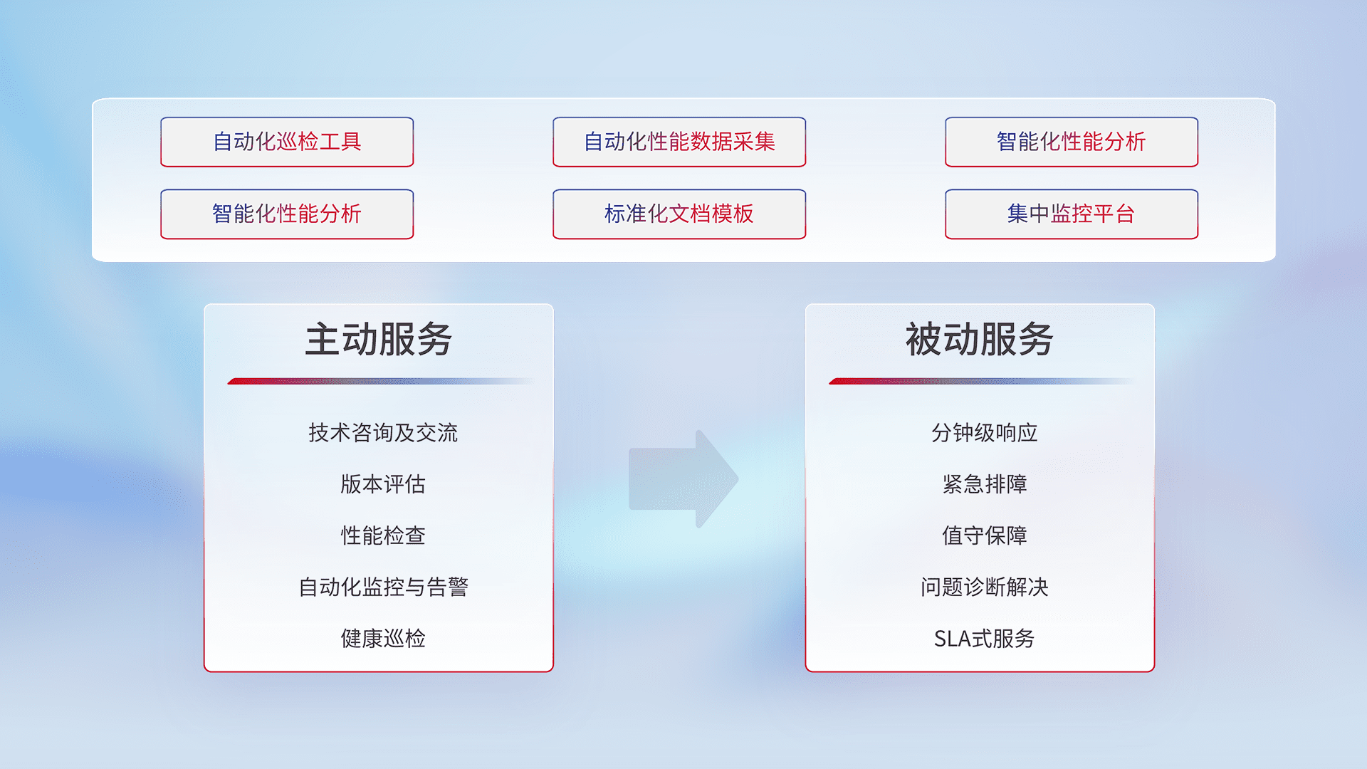 智能化工具和标准化文档,,,,保障服务质量,,,,提供主动服务(包含技术咨询、、、版本评估、、、性能检查、、、、自动化监控与告警、、健康巡检)和被动服务包含(分钟级响应、、、、紧急排障、、、、值守保障、、、问题诊断解决、、、SLA服务)。。。